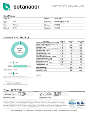 All BackWoodz premium CBD flower products go through 3rd party testing and organically grown without the use of pesticides. Box of Riches Hydro tests out with a 14.60 CBD% and under .3% Delta-9 THC. BackWoodz hemp flower is U.S Farm Bill compliant under the Agriculture Improvement Act (Sec. 10113).