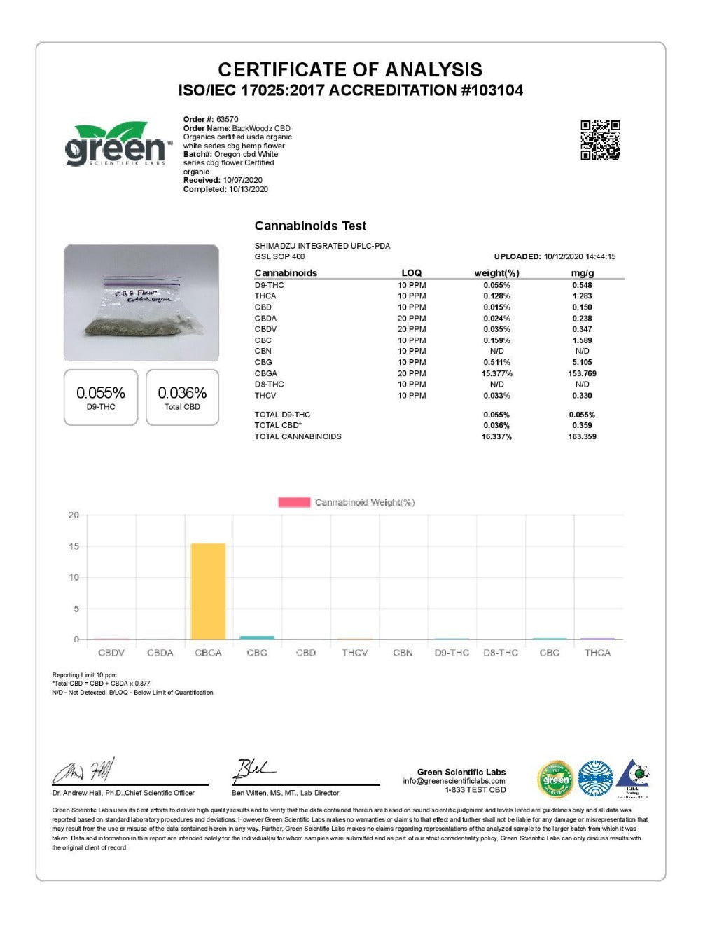 All BackWoodz premium CBG flower products go through 3rd party testing and organically grown without the use of pesticides. Organic White tests out with a 15.30 CBG% and under .3% Delta-9 THC. BackWoodz hemp flower is U.S Farm Bill compliant under the Agriculture Improvement Act (Sec. 10113).
