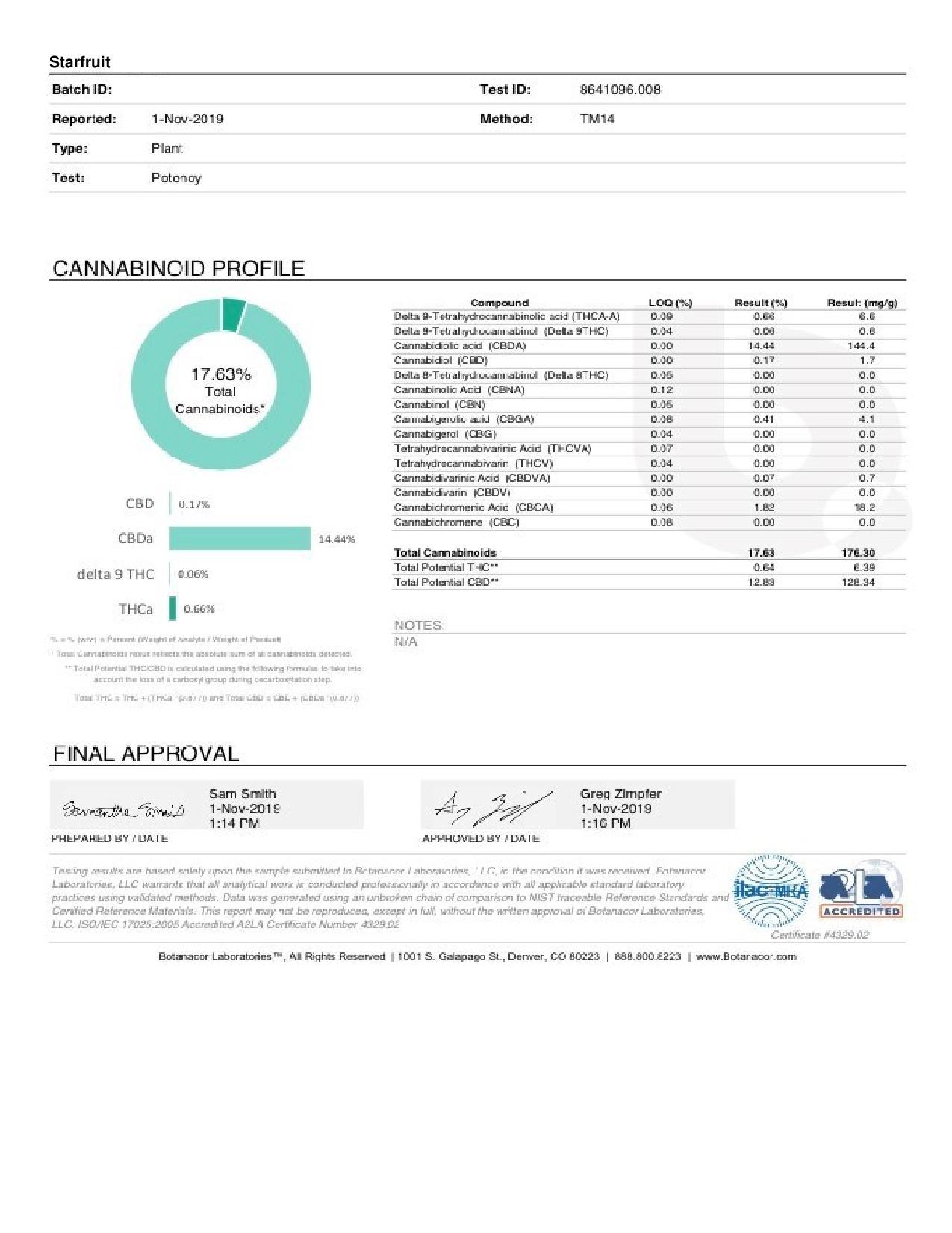 StarFruit is a flavor loaded strain that is true to it's name. These beautiful buds present a tangy, tropical taste with a hint of vanilla on the nose. This smooth smoke leaves floral notes of lavender making it a truly exotic experience.