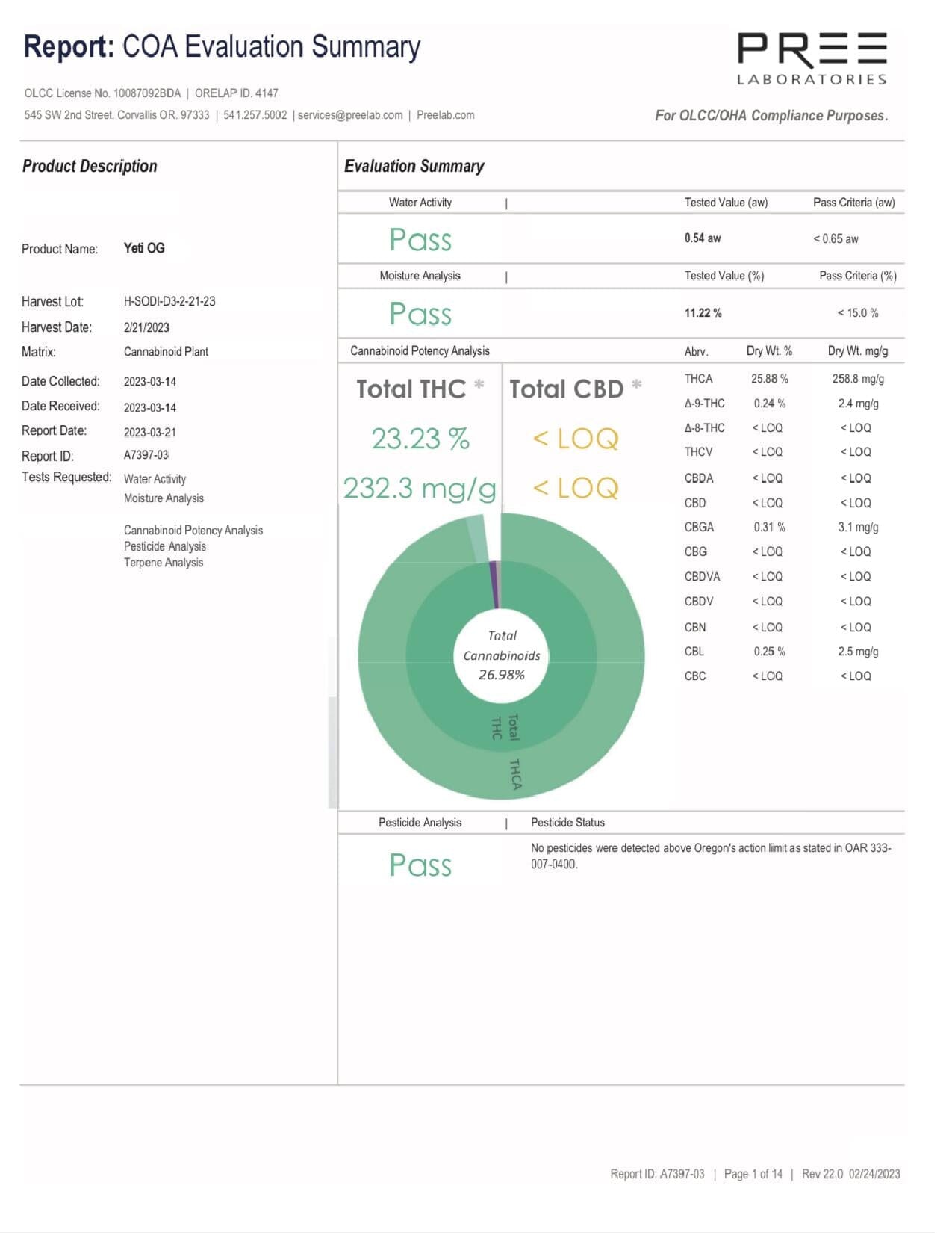 All BackWoodz premium hemp flower products go through 3rd party testing and organically grown without the use of pesticides. Yeti OG tests out with a 23.23 THCA% and under .3% Delta-9 THC. BackWoodz hemp flower is U.S Farm Bill compliant under the Agriculture Improvement Act (Sec. 10113).