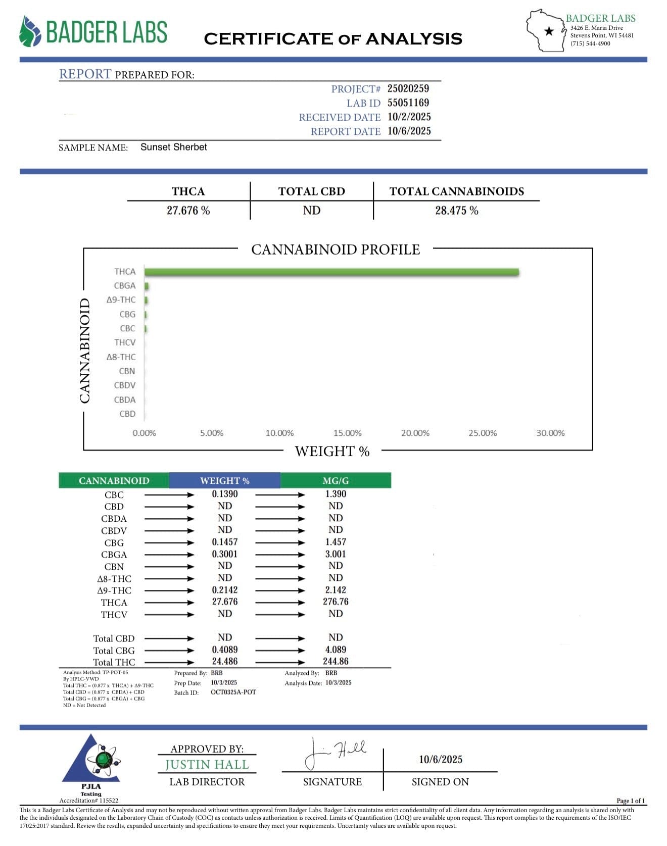 We've got Sunset Sherbet crumble, now we have the mastermind behind it! This strain has relaxing and calming effects without affecting your head too much. For daily users, this strain is great for anytime. If you're a social smoker, Sunset Sherbet is better for nighttime socialization. These evergreen-shaped nuggs are dense, frosty, and splotched with an array of your usual cannabis rainbow. THC-A is a natural cannabinoid found in hemp flower. No conversion or infusion method is used in this product.