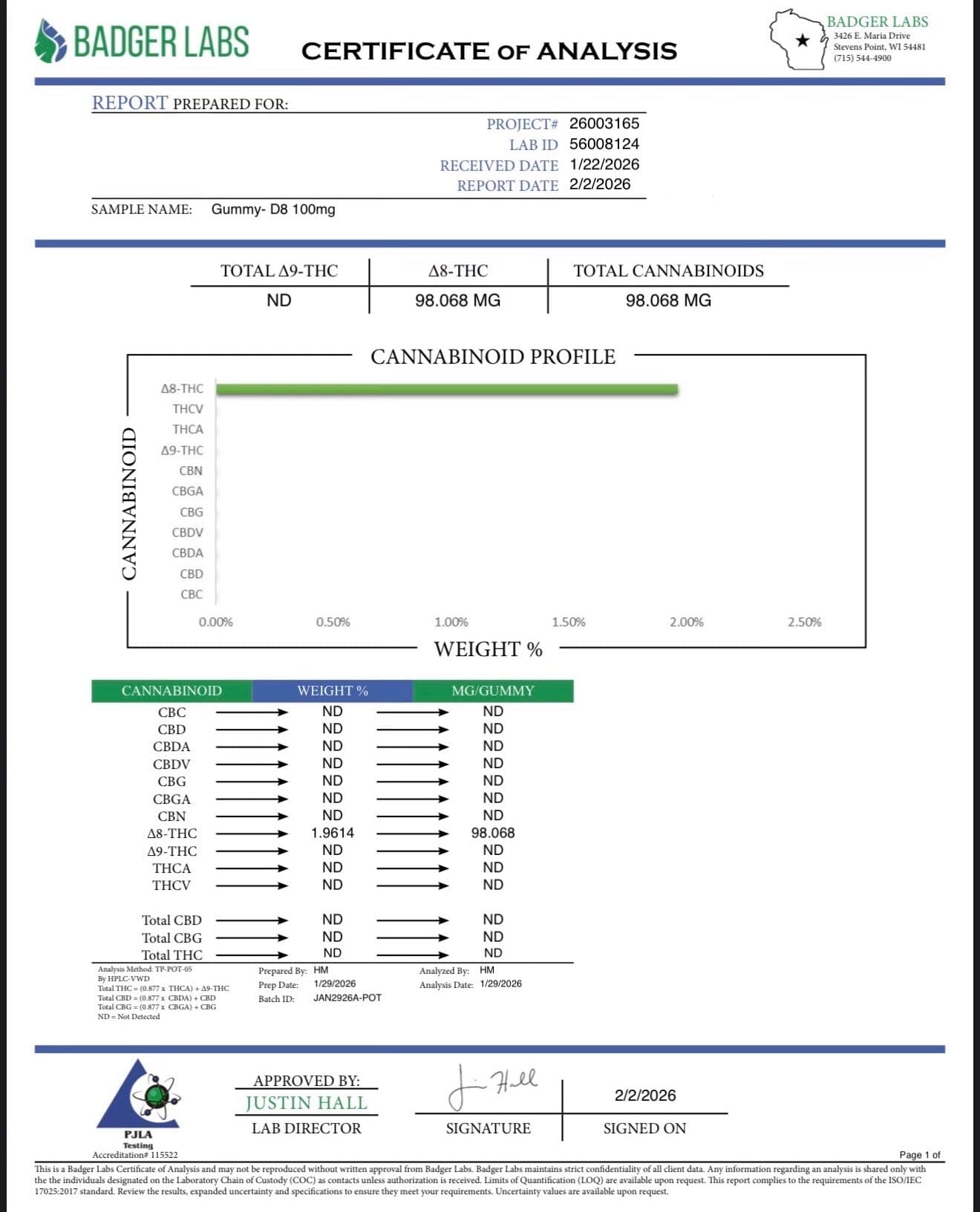 Ingredients: Organic Tapioca Syrup, Organic Cane Sugar, Fruit Pectin, Organic Flavor Extract, Potassium Citrate, Citric Acid, Natural Vegetable Extracts (Coloring), Hemp Derived D8 Distillate.