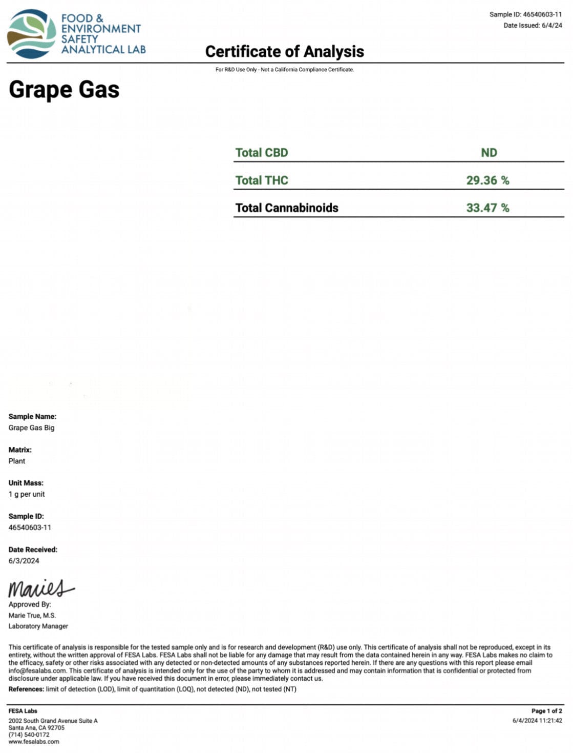 Limited Time! Grape Gas is a perfectly balanced 50/50 hybrid that yields a deeply colored flower that is nicely dusted with trichomes. These buds bring on a mix of funky flavors, with hints of grape, spices and gassy undertones. The aroma is a mix of berries, diesel, spices and slight earthy notes. These flowers are hybrid and a well-rounded choice for all-day smoke sessions. Grape Gas provides extreme cerebral effects with full body relaxation. THC-A is a natural cannabinoid found in hemp flower. No conversion or infusion method is used in this product.