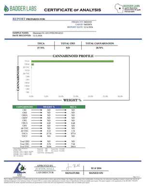 Limited Time! Indoor Illuminati OG is an ultra rare indica dominant cultivar that is just as mysterious as it is potent. The flavors and aromas on this cut of Josh D’s 1996 Club 33 OG is a balance of herbal, earthy and floral notes. These beautiful buds carry a top-shelf bag appeal with heavy couch-locking indica effects. Illuminati OG provides extreme potent cerebral effects with full body relaxation. THC-A is a natural cannabinoid found in hemp flower. No conversion or infusion method is used in this product.