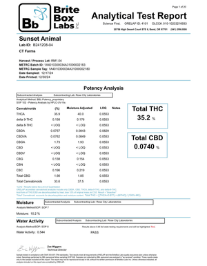 All BackWoodz premium hemp flower products go through 3rd party testing and organically grown without the use of pesticides. Sunset Animal tests with 35.20% THCA and is under .3% Delta-9 THC. BackWoodz hemp flower is U.S Farm Bill compliant-- under the Agriculture Improvement Act (Sec. 10113).