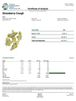 Limited Time! Indoor Strawberry Cough is a sativa lover's dream. Packed with both potency and flavor this sought after strain is a must have for the collection. SBC has a unique berry and floral nose that carries over to the exhale. This 80/20 sativa dominate cultivar is best for daytime use. Strawberry Cough provides extreme cerebral effects with full body relaxation. THC-A is a natural cannabinoid found in hemp flower. No conversion or infusion method is used in this product.