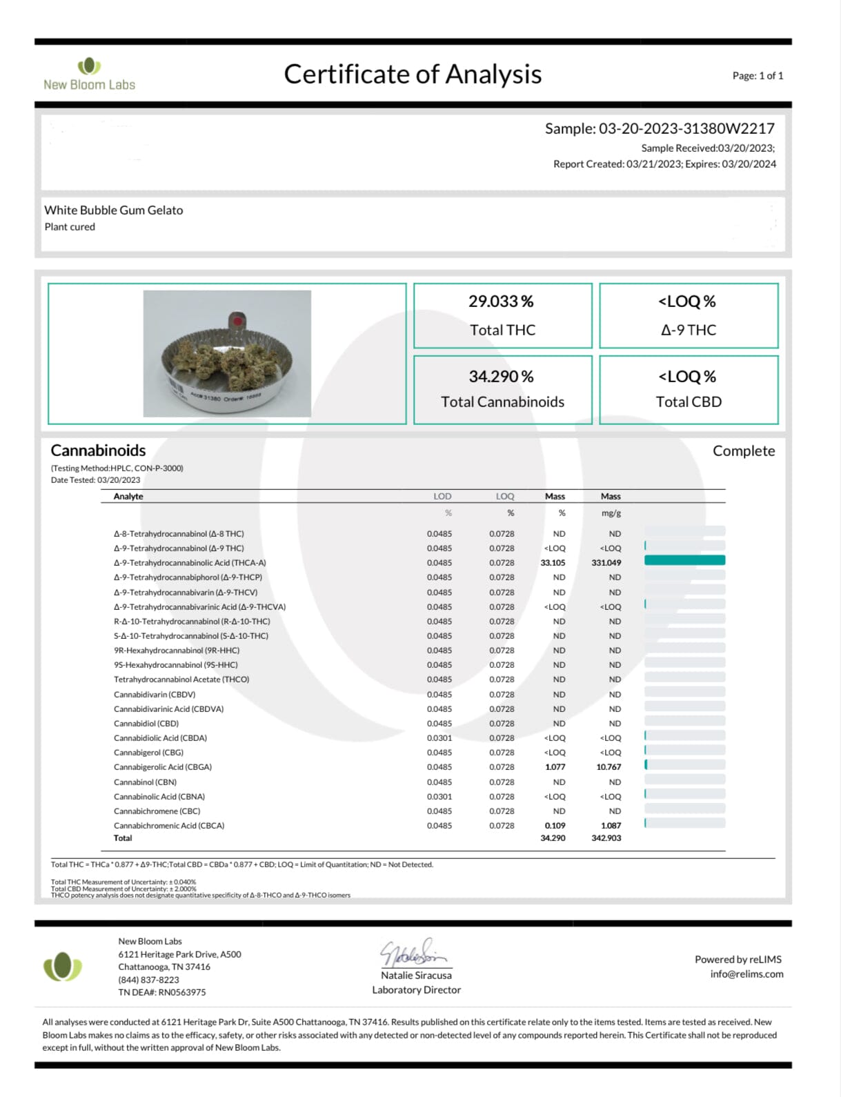 All BackWoodz premium hemp flower products go through 3rd party testing and organically grown without the use of pesticides. White Bubblegum Gelato tests out with a 29.03 THCA% and under .3% Delta-9 THC. BackWoodz hemp flower is U.S Farm Bill compliant under the Agriculture Improvement Act (Sec. 10113).