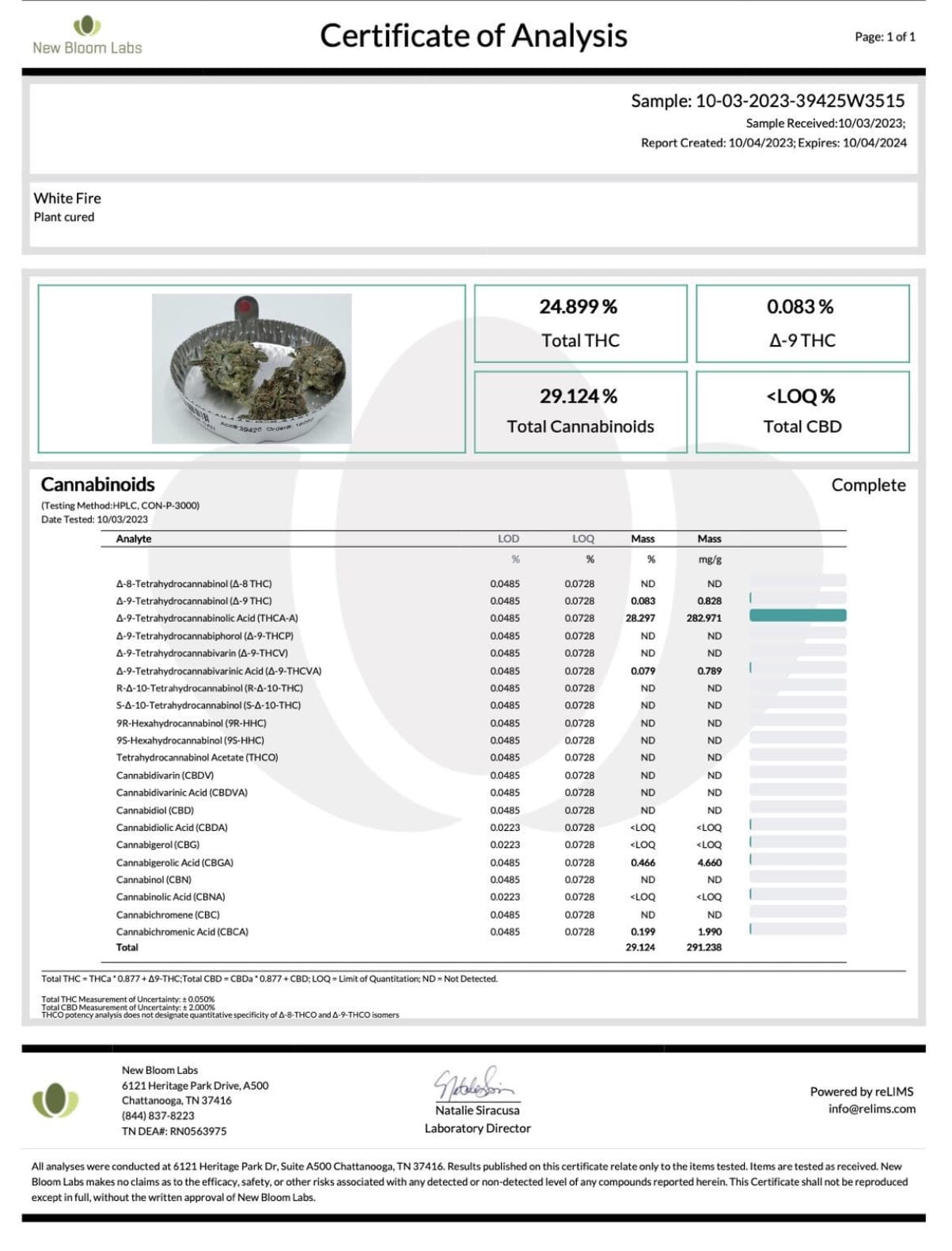 All BackWoodz premium hemp flower products go through 3rd party testing and organically grown without the use of pesticides. White Fire tests out with a 28.29 THCA% and under .3% Delta-9 THC. BackWoodz hemp flower is U.S Farm Bill compliant under the Agriculture Improvement Act (Sec. 10113).